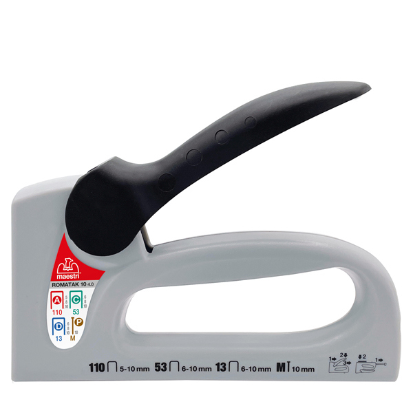 Fissatrice manuale compatta e maneggevole che consente la massima capacita' di infissione con il minimo sforzo. Adatta per l'assemblaggio di telai, cornici in legno, lavori di decorazione, fissaggio tappezzeria, ricopertura di divani, mobili e di tutti i tipi di carta e stoffa. Maniglia antiscivolo. Infissione: Infigge completamente il punto nel legno di media durezza. Manualita' ed ergonomia : La fissatrice e' dotata di un'ampia zona di appoggio che garantisce la massima stabilita'. Maniglia composta da 2 elementi; la struttura in acciaio indurito e' ricoperta in resina poliuretanica studiata per ottenere la massima ergonomia ed un'ottima impugnabilita'. Corpo: In Nylon caricato al 30% fibre di vetro per garantire un prodotto di qualita' e di lunga durata. La scelta del materiale, con caratteristiche superiori al comune ABS, consente una durata 2-3 volte superiore rispetto alla concorrenza. Leva di azionamento: Leva di Ad azione diretta. Puo' essere riposizionata senza dover sparare a vuoto. Bloccaggio leva mediante incastro per arretramento maniglia. Caricamento: Da sotto con carrello estraibile con tasto di chiusura a molla che permette di eliminare gli inceppi ed evitare l'usura della lametta e del carrello. Spingipunto: Del tipo non estraibile con molla e pressore protetti. Disinceppo: La spinta elastica del carrello contro il frontale riduce gli inceppi. In caso di inceppo pesante, il carrello si sgancia e le parti interessate non vengono danneggiate. Dimensioni: aperta 125 ; chiusa 165 x 90 x 28 mm. Peso: Kg. 0,248. Durata: Circa 10.000 colpi.Profondita' di cucitura: 5-10mm. Punti: 105 - 108 - 110 ; 53/6 - 53/8 - 53/10; 13/6 - 13/8 - 13/10. Chiodi con testa M10 Max.