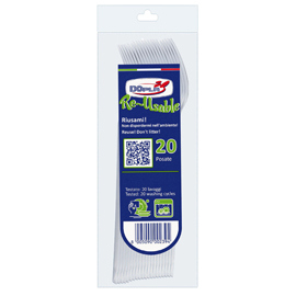 Posata in PS REUSE. Colore: trasparente. Confezione da 20 pezzi. Materiale: Polistirene. Riciclabile 100%. Riutilizzabile, testato per 20 lavaggi. Max 90 gradi per 15 minuti. Non adatto all'uso nel forno.
