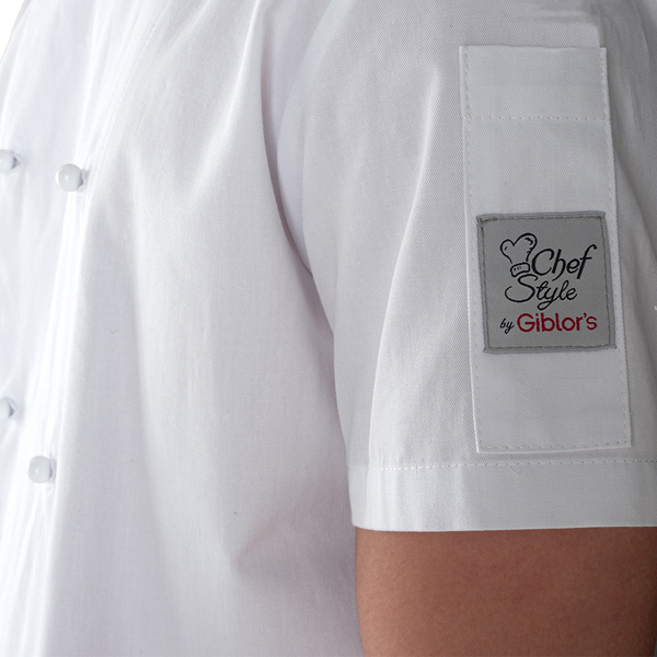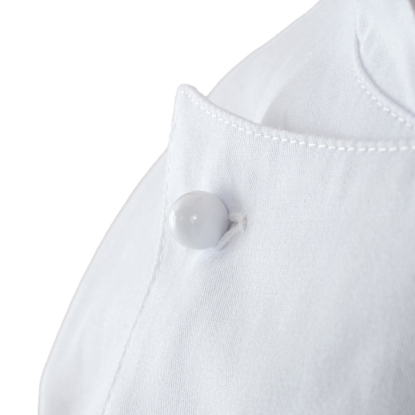 Giacca da cuoco a manica corta con abbottonatura doppio petto, collo arrotondato e porta penne sulla manica sinistra. Vestibilita' Slim Fit e bottoni estraibili sulla pettorina davanti. Realizzata in tessuto 100% cotone nella variante bianca. Ha la variante manica lunga nella giacca Adriano. Taglie: XS, S, M, L, XL, XXL, 3XL, 4XL, 5XL.