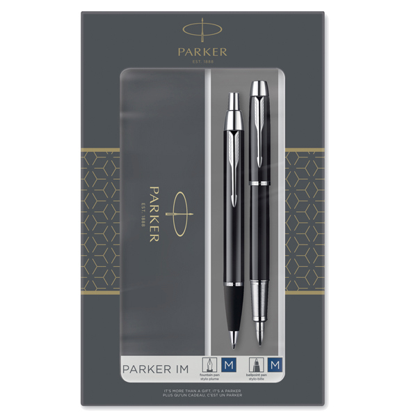 Elegante set in confezione regalo che comprende penna a sfera M IM Black CT + stilografica M IM Black. Realizzate in acciaio inox con eleganti dettagli cromati. Dotate dell'iconica clip a freccia Parker. Fornite con refill colore blu.
