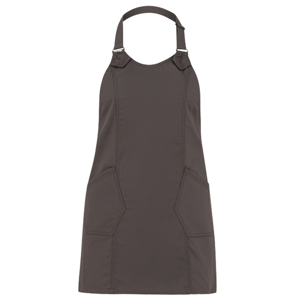 Grembiule Virginia finitura tortora con 2 tasche e allacciatura collo regolabile con fibbia. Colore: tortora. Taglia unica. 98% cotone e 2% elastan.