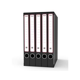 Sistema di archiviazione king mec composto da un'unica custodia con 5 cartelline a 2 anelli dorso 4cm. Formato utile 23x32cm (lxh). Struttura in robusto cartone grigio rivestito con carta goffrata nera antimpronta. Custodia in tinta con parabordi. Anello di estrazione in acciaio. Etichetta adesiva gia' posizionata sul dorso. Ideale per raggruppare fogli perforati. Dimensioni esterne 23,5x25x35cm.