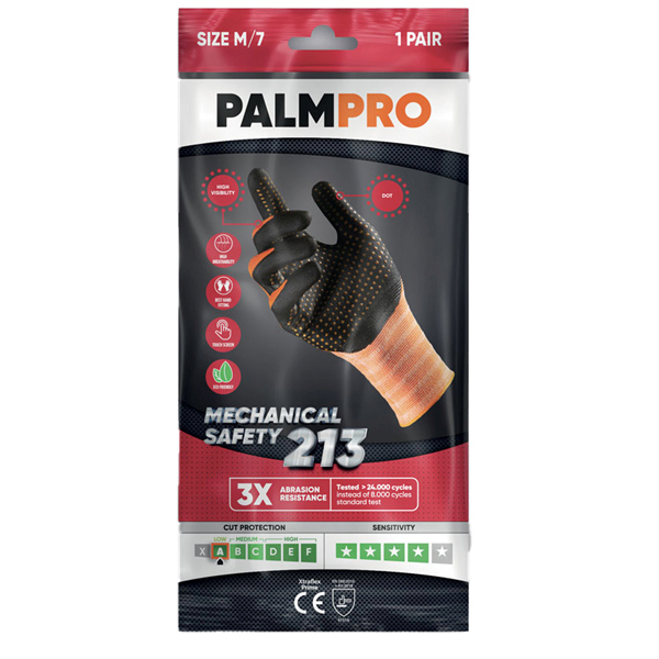 Guanto anatomico (mano destra e sinistra) riusabile in supporto di nylon/poliestere/Spandex, monofilo lavorato a maglia senza cuciture, di colore arancio Hi-visibility con forma ''stretch to fit'' e rivestimento sintetico in nitrile ''foam'' microporoso e traspirante, con puntinatura in rilievo ''DOT'' su palmo e dita, dorso areato, polsino elastico con trama latex. Taglie disponibili dalla M (7,5) alla XXL (10,5). Conforme al Regolamento (UE) 2016/425 e alle Norme armonizzate, EN 388:2016+ A1:2018 ed EN 420-2003 + A1:2009. Guanti realizzati con materiali certificati secondo la norma Standard 100 by OEKO-TEX (prodotti di classe II). Prodotti in stabilimenti certificati ISO 9001:2015.