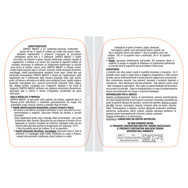 Insetticida-acaricida multinsetto pronto all'uso in grado di snidare gli insetti dal proprio riparo, abbatterli rapidamente e prevenire l'insorgere di successive infestazioni anche fino a 4 settimane. Efficace contro insetti volanti (zanzare tigre e comune, mosche), insetti striscianti (formiche, scarafaggi), insetti particolarmente resistenti come ragni. Utilizzabile sulla vegetazione per il trattamento delle zanzare (cespugli, siepi, viali, parchi, prati); all'interno e all'esterno di edifici come abitazioni (muri, vialetti, soglie e davanzali, marciapiedi, etc). Modalita' d'uso: agitare e spruzzare nella zona da trattare. Spruzzare nelle ore piu' fresche. Tecnologia con solventi a basso impatto ambientale - Vapo no gas. Composizione: Cipermetrina pura 0,25% - Denatonium Benzoate puro 0,001 %. Registrazione: DARTEX IN & OUT Presidio Medico Chirurgico - Registrazione del Ministero della Salute n. 20386 - DI LIBERA VENDITA. Puo' provocare reazione allergica. Molto tossico per gli organismi acquatici con effetti di lunga durata.