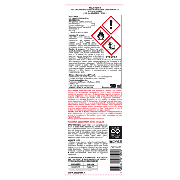 Insetticida abbattente non residuale. Permette di rientrare velocemente nell'ambiente. Indicato per: mosche, zanzare in ambiente interno. Composizione: Tetrametrina 0,20% - Piperonil Butossido 0,60% Registrazione: Presidio Medico Chirurgico n. 18780 DI LIBERA VENDITA. Modalita' d'uso: 1) chiudere porte e finestre. 2) agitare prima dell'uso 3) spruzzare il prodotto verso l'alto o dirigerelo spruzzo direttamente nei luoghi di infestazione e comunque lontano dalle persone (sono sufficienti 4-5 secondi per un ambiente di medie dimensioni)