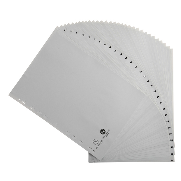 Marchio exacompta. Sono ideali per l'organizzazione dei tuoi documenti personali e professionali. Materiale polipropilene. Spessore 12/100e. Dimensione prodotto 22,5x29,7cm. Formato utile A4. Tipo di prodotto intercalari. Tipo numerico. Tipologia intercalari numerici. Tasti 1-31. Formato A4 (21x29,7cm). Numero tasti 31. Colore grigio. Materiale pp riciclato.