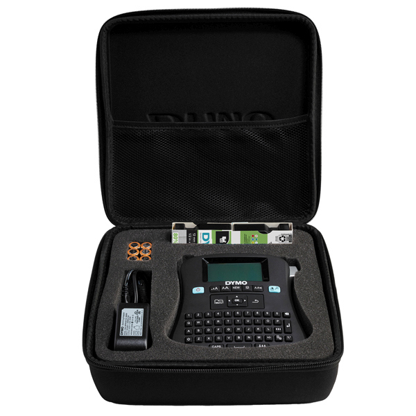 DYMO LabelManager 210D kit etichettatrice portatile, tastiera QWERTY,con custodia ed etichette D1 12 mm stampa nero su bianco. Il kit include: etichettatrice LM210D, 1 nastro per etichette D1: stampa nero su bianco, 12 mm x 7 m, 2 adattatori CA (EU e UK), guida di riferimento rapido e custodia. Digita e modifica il testo rapidamente grazie alla tastiera simile a quella del computer (QWERTY) e a un ampio display. Salva fino a 9 etichette, stampa fino a 10 copie di un'etichetta e crea etichette con caratteri in 6 dimensioni e 7 stili diversi oltre a 8 tipi di caselle differenti.Guida rapida. Alimentatore AC o adattatore opzionale (cod.37883) Garanzia limitata di 2 + 1 anno.