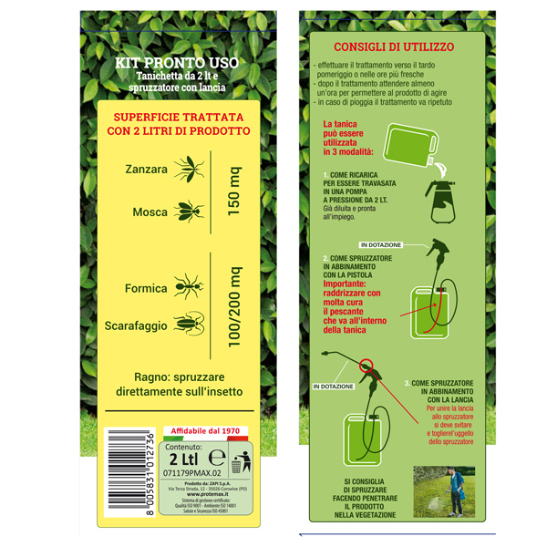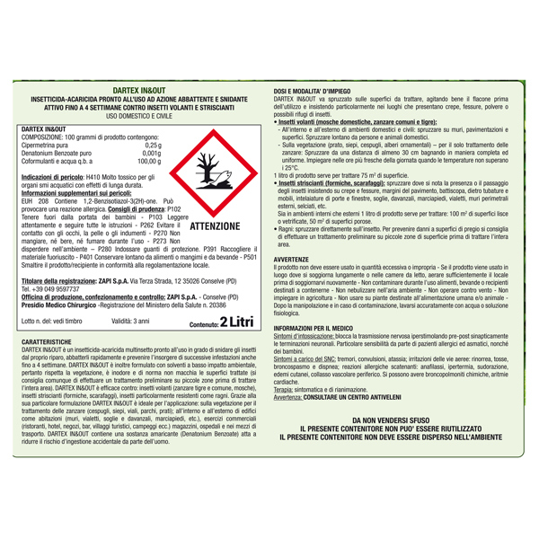 Kit insetticida anti zanzare pronto all'uso con sistema combinato lancia e tanica, permette di poter trattare una superficie piu' ampia. Il prodotto una volta spruzzato ha un'azione abbattente e snidante prolungata fino a 4 settimane contro molti insetti quali zanzare tigri e comuni, formiche, scarafaggi, ragni. Indicato per vegetazione: prato, siepi, cespugli, alberi ornamentali. Utilizzabile all'interno e all'esterno di ambienti domestici e civili, soglie, davanzali, vialetti. Modalita' d'uso: montare la lancia sulla tanica seguendo le indicazioni contenute nella confezione. Agitare e spruzzare nella zona da trattare. Spruzzare nelle ore piu' fresche. La tanica puo' essere utilizzata anche come refill per una pompa a pressione. Composizione: Cipermetrina pura 0,25% - Denatonium Benzoate puro 0,001 %. Registrazione: Dartex In e Out. Presidio Medico Chirurgico - Registrazione del Ministero della Salute n. 20386 - di libera vendita. Tecnologia con solventi a basso impatto ambientale. La confezione copre circa 150mq.