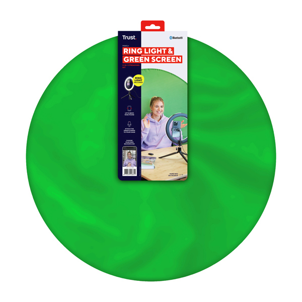 Kit streaming 2-in-1 con luce ad anello e green screen per migliorare la tua postazione gaming - Green screen pieghevole da 142 cm per scegliere un qualsiasi sfondo con te al centro - Il green screen puo' essere agganciato alla maggior parte delle sedie tramite fasce in velcro - Anello luminoso LED da 10'' che proietta sul volto una luce graziosa - Il telecomando integrato permette di regolare la luminosita' e la temperatura del colore - Compatibile con telefoni, fotocamere e webcam per iniziare subito a trasmettere - Include il controller Bluetooth, per il controllo in wireless dell'otturatore del telefono - Alimentazione USB, compatibile con qualsiasi caricabatterie per telefono o powerbank (non forniti in dotazione).