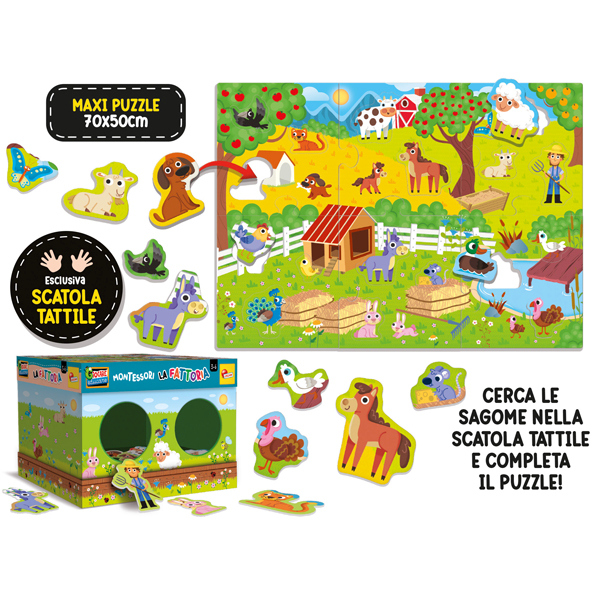 Ungrande puzzle con gli animali della fattoria da mettere nellagrande scatola tattile e riconoscere usando solo il tatto. Eta' consigliata 3-6 anni.