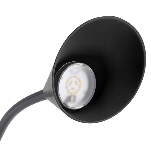Lampada con calotta disegnata per illuminare in modo ottimale il piano lavoro. Il braccio flessibile consente di orientare la luce in qualunque posizione. Interruttore on/off sul cavo. Base e calotta diametro 14cm. Braccio in metallo con elastomero. testa e base in ABS. Led 7,4W integrato. (non sostituibile). Made in China. Classificazione energetica: E.