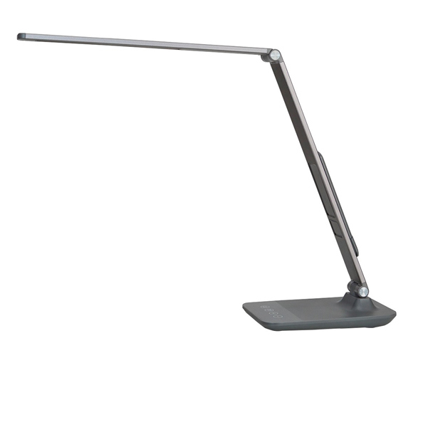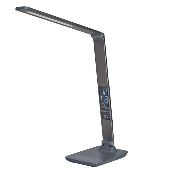 Lampada a LED integrato 10W con testa e braccio inclinabili in alluminio e ABS. Porta USB per ricaricare i tuoi supporti. Display LCD con funzione calendario e termometro. Intensita' della luce in 3 colori bianco, giallo e naturale. Interruttore On/Off posizionato sul retro della lampada. - Lunghezza braccio: 35cm - Dimensioni testa: 32cm - Dimensioni base: 19 x 12cm Classe energetica: G - Garazia di 3 anni.