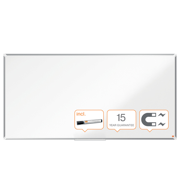 Lavagna bianca in acciaio laccato con superficie magnetica. Adatta per usi moderati. Buona capacita' di cancellatura e resistenza a macchie di inchiostro, segni di pennarello, graffi e ammaccature. Dotata di portapennarelli rimovibile.
