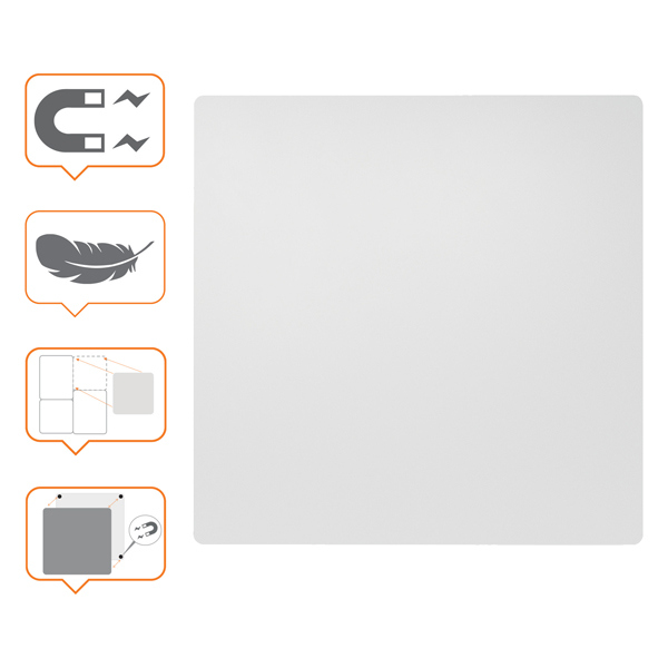 Questa elegante lavagna magnetica senza cornice e' lo strumento di collaborazione ideale per qualsiasi ambiente d'ufficio. Il suo design modulare consente di creare e ampliare lo spazio di scrittura in base alle proprie esigenze, senza alcun limite. Grazie all'innovativo sistema di montaggio magnetico, le lavagne leggere possono essere facilmente rimosse per essere utilizzate su una superficie piana e reinserite a parete in qualsiasi momento, offrendo la massima flessibilita'. Lavagna magnetica in acciaio Dimensioni 45x45cm.