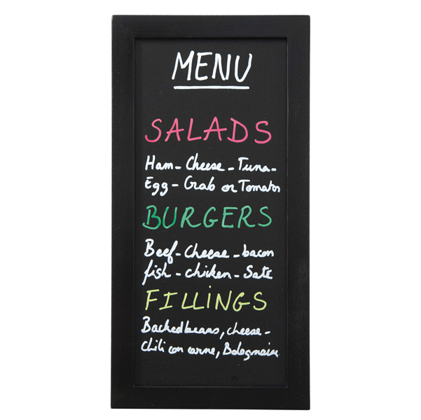 Lavagna di qualita' con cornice in legno laccato nero L2cm H1cm. Fondo lavagna nera in resina melaminica da 4mm. Adatta per uso interno e esterno.Superficie di scrittura doppia, non porosa, antigraffio, antiuro e resistente ai raggio UV. Fornita con kit di mo ntaggio a parete e 1 pennarello a gesso liquido bianco.