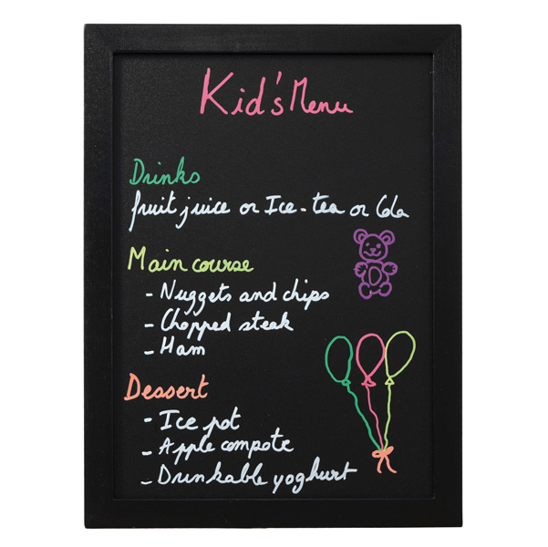 Lavagna di qualita' con cornice in legno laccato nero L2cm H1cm. Fondo lavagna nera in resina melaminica da 4mm. Adatta per uso interno e esterno.Superficie di scrittura doppia, non porosa, antigraffio, antiuro e resistente ai raggio UV. Fornita con kit di mo ntaggio a parete e 1 pennarello a gesso liquido bianco.