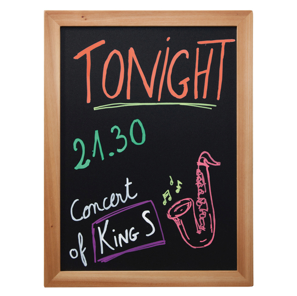 Lavagna di qualita' con cornice in legno teak L2cm H1cm. Fondo lavagna nera in resina melaminica da 4mm. Adatta per uso interno e esterno.Superficie di scrittura doppia, non porosa, antigraffio, antiuro e resistente ai raggio UV. Fornita con kit di mo ntaggio a parete e 1 pennarello a gesso liquido bianco.