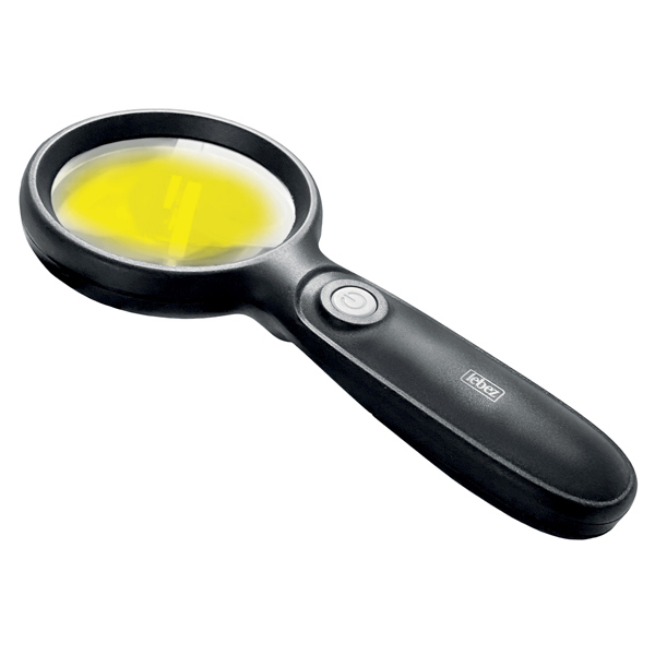 Lente d'ingrandimento con luce a due led; diam. 7,5 cm 2,5 ingrandimenti. Funziona con 2 batterie AAA non incluse.