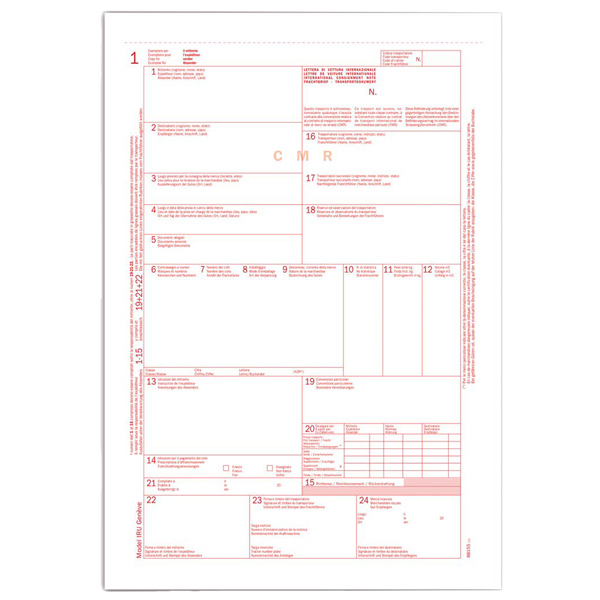 Lettera di vettura internazionale CMR, 5 copie snap autoricalcanti. Formato 31x21cm.