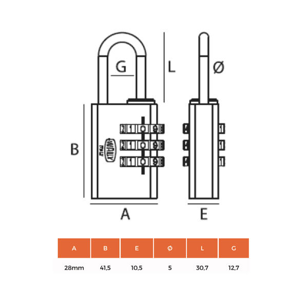 Lucchetti dal corpo in ottone e arco in acciaio tempreto. Combinazione a a 4 pomelli. Confezione in blister. Dimensione: H 41,5 x L 28mm, Altezza complessiva (arco incluso) 69,5mm.