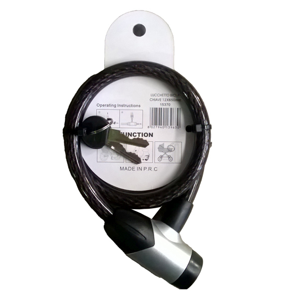 Lucchetto a spirale a due chiavi. Dimensioni 12x650mm. Consigliato per biciclette e moto.