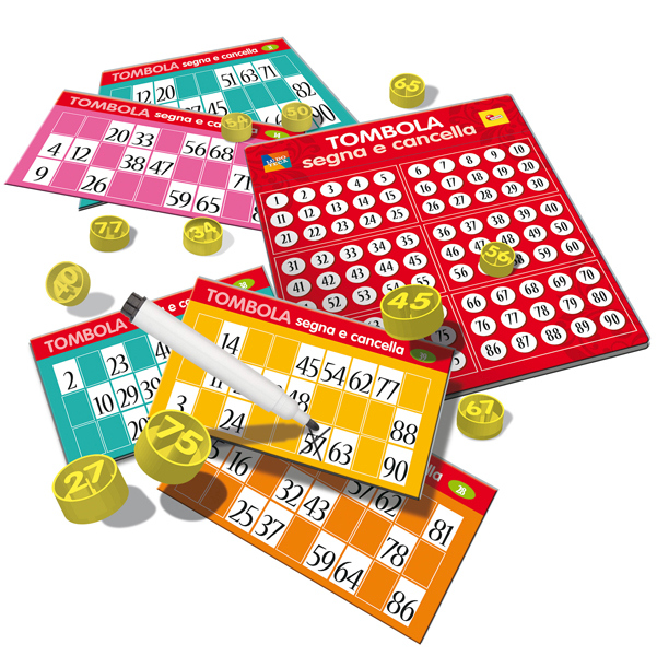 Un originale versione che utilizza 48 cartelli e speciali pennarelli cancellabili per segnare i numeri estratti.grande divertimento per tutta la famiglia. Eta' consigliata 6-99 anni.