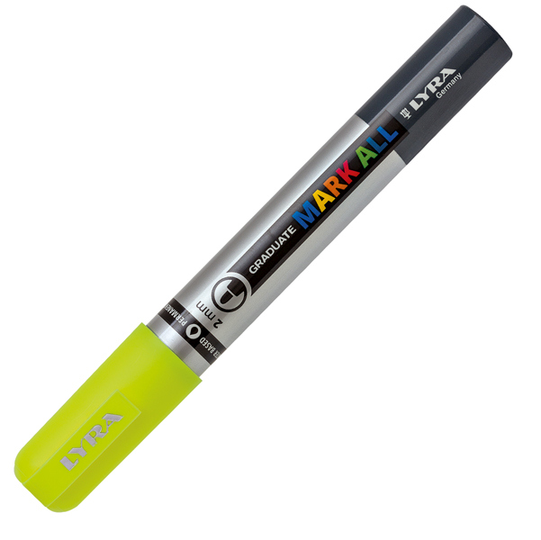 Marcatore indelebile a base d'acqua. Colori brillanti e coprenti. Scrive su carta, plastica, cd, tessuti, vetro, metallo. Non passa la carta.Punta conica in fibra da 2mm. Colore: giallo fluo.