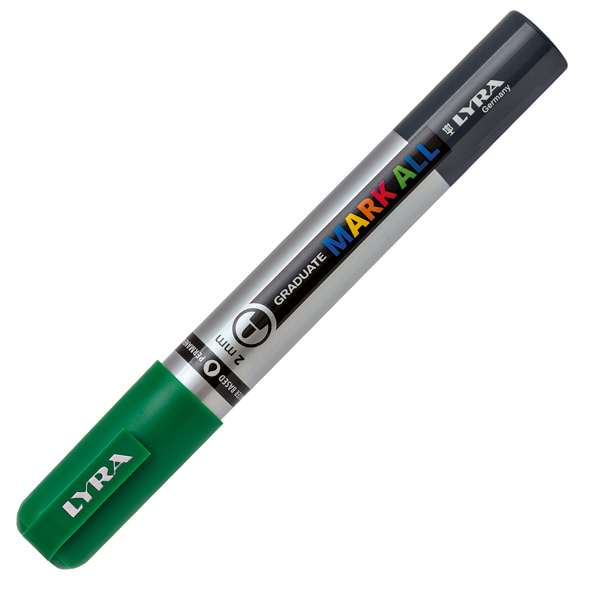 Marcatore indelebile a base d'acqua. Colori brillanti e coprenti. Scrive su carta, plastica, cd, tessuti, vetro, metallo. Non passa la carta. Punta conica in fibra da 2mm. Colore: verde prato.