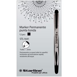 Marcatore STARLINE con inchiostro permanente resistente all'acqua. Dotato di cappuccio con clip. Fusto con inserti gommati per una impugnatura confortevole. Punta: tonda. Colore: nero.