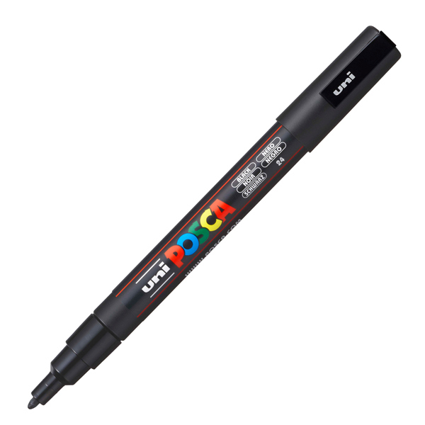 Inchiostro pigmentato a base d'acqua dal colore intenso e coprente. Sicuro e inodore. Resistente all'acqua, non passa la carta e non sbiadisce. Lasciato asciugare, il colore puo' essere coperto da un'altra tonalita'. Scrive su carta, plastica, vetro, metallo, ecopelle e tessuti. Punta 0,9-1,3mm. Colore nero.