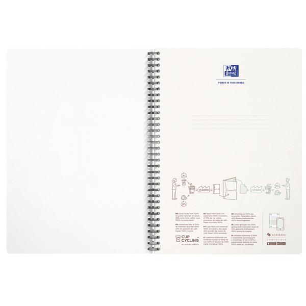 Maxiquaderni spiralati con copertina in colori naturali realizzata con carta riciclata al 100% contenente fibre riciclate da bicchieri di carta usati. 180 pagine di carta da 90gr bianca 100% riciclata e liscia per una esperienza di scrittura confortevole senza che l'inchiostro attraversi la pagina. Spirale doppia di colore grigio. Rigature funzionali con margine e intestazione per prendere appunti in modo organizzato. Speciali marcatori agli angoli delle pagine da utilizzare con l'app scribzee . La gamma my rec'up ha ricevuto la certificazione pefc recycled ecolabel.