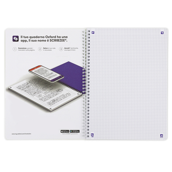 Maxi spiralato A4+ con copertina in cartoncino flessibile in 5 colori fluo: fucsia, verde, arancio, giallo e azzurro. Spirale di colore bianco. 120 pagine con microperforazione e 4 fori, rigatura 4mm, 5mm e 1R. Carta Optik Paper da 90 g., bianchissima, liscia, satinata e resistente agli strappi; l'inchiostro non attraversa la pagina. Speciali marcatori agli angoli delle pagine da utilizzare con l'App SCRIBZEE.