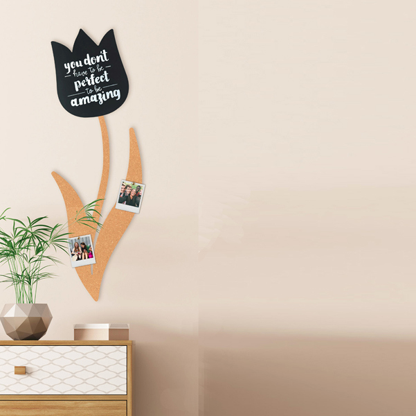 Mix di lavagna in sughero e nera a forma di tulipano. Scrivibile nella parte nera, utilizzabile con le puntine nella parte sughero. Fornita con puntine, marcatore bianco e biadesivi per il fissaggio a parete. Dimensione: 82,5x29cm.