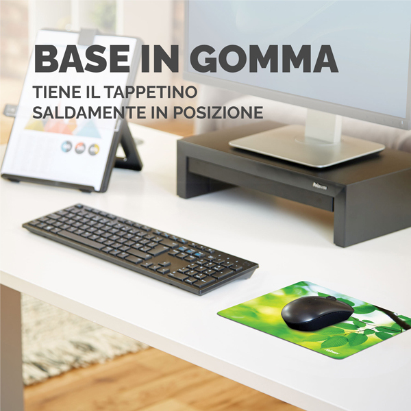 Tappetino mouse composto per il 95% in materiale riciclato e riciclabili al 100%. Superficie facile da pulire, scorrimento perfetto del mouse. Dimensione: 23,2x21,4x0,8cm.