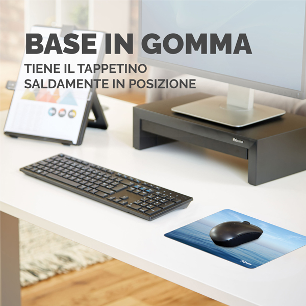 Tappetino mouse composto per il 95% in materiale riciclato e riciclabili al 100%. Superficie facile da pulire, scorrimento perfetto del mouse. Dimensione: 23,2x21,4x0,8cm.