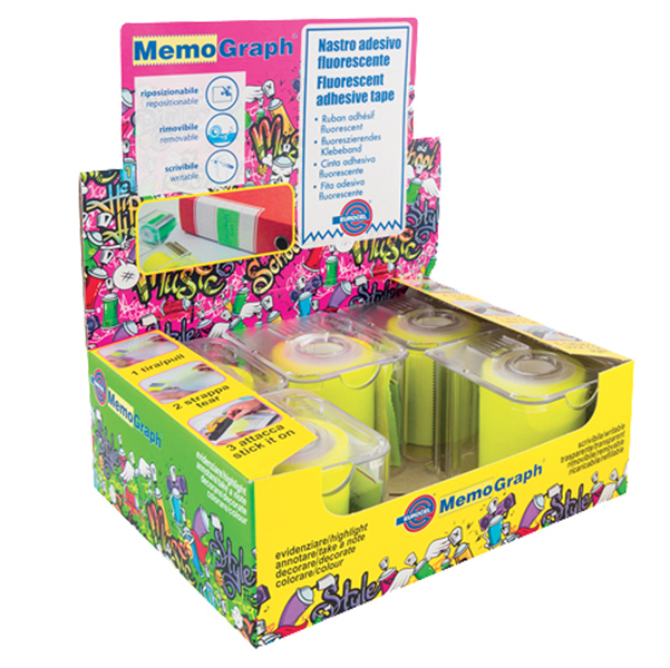 Dispenser con nastro adesivo scrivibile e rimovibile, completamente trasparente in colori fluo. Sostituisce il classico foglietto adesivo ma senza staccarsi dalle superfici. Dotato di adesivo rimovibile, puo' essere staccato e riattaccato piu' volte senza rovinare i documenti.