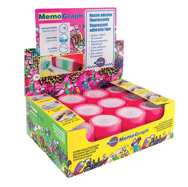 Nastro adesivo scrivibile e rimovibile, completamente trasparente in colori fluo. Sostituisce il classico foglietto adesivo ma senza staccarsi dalle superfici. Dotato di adesivo rimovibile, puo' essere staccato e riattaccato piu' volte senza rovinare i documenti.