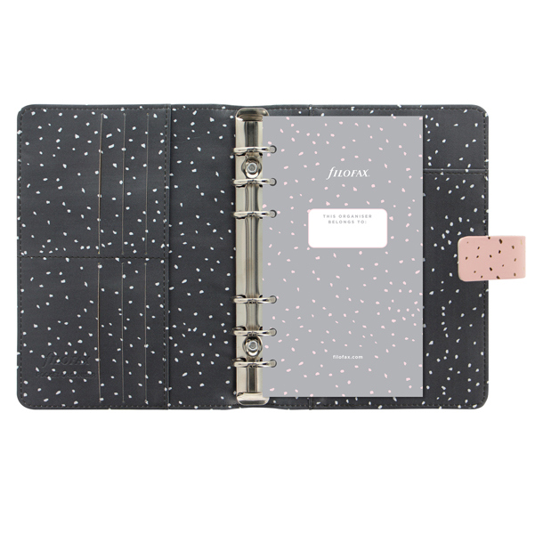 Organiser della nuova collezione Confetti di design accativante ed interni fantasia con preziosi effetti a contrasto. Copertina liscia a motivi Botanical, chiusura con cinturino. Dotato di anello portapenna e tasche interne. Contiene agenda settimanale su 2 pagine multilingua. Carta da 80gr, adatta a penne stilografiche.