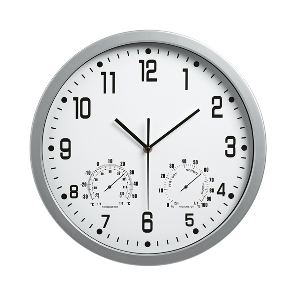 Orologio da parete in ABS con igrometro e indicatore di temperatura, funzionamento a batteria (non inclusa). Diametro 35 x 4 cm. Orologio non dotato di meccanismo silenzioso.