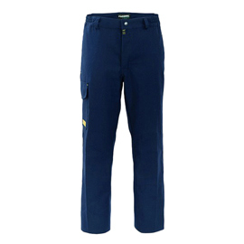 Pantalone da lavoro con chiusura alla patta con cerniera e bottone automatico. Due tasche anteriori interne, tasca posteriore applicata a destra chiusa con aletta e velcro, tascone laterale chiuso con aletta e velcro applicato su gamba destra. Elastico ai fianchi, etichetta jacquard con pittogrammi cucita sul tascone, travette varie di colore giallo.