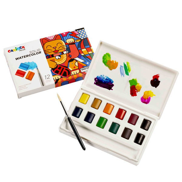 Acquerelli solidi a grana fine, che grazie all'alta pigmentazione garantiscono una facile miscibilita' e resistenza alla luce per il disegno artistico. Colori vividi e brillanti. Pennello incluso nell'astuccio.