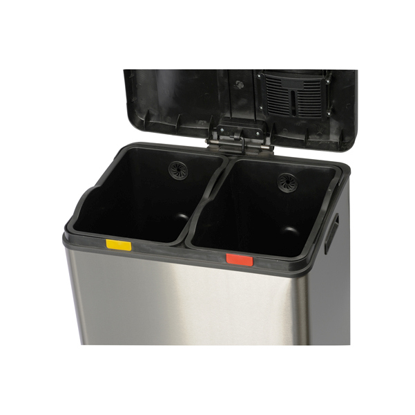 Ideale per la raccolta differenziata - utilizzo indicato dove e' necessario attenersi alle procedure haccp. Struttura in acciaio inox satinato antitraccia con base in ABS. Maniglie laterali per un facile spostamento. Secchi interni in PPL. Sistema di chiusura del coperchio rallentato e silenzioso. Dimensioni: 2x30lt - 49,5x45,9x63,6cm. Effettuare una periodica manutenzione per prevenire l'ossidazione del materiale utilizzando una spugna non abrasiva e sciacquando con abbondante acqua, preferibilmente calda. Per prevenire la formazioni di macchie ed aloni e' consigliabile asciugare la superficie con uno straccio di cotone. Ogni 10 o 20 pulizie ordinarie, e' consigliabile utilizzare prodotti specifici per inox, in spray o crema, non aggressivi.