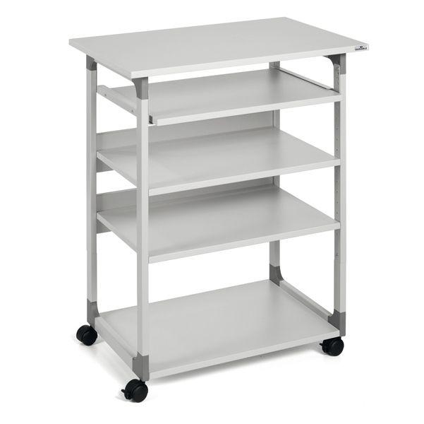 Struttura in acciaio verniciato con polveri epossipoliestere antigraffio e raccordi angolari in plastica resistente. Regolabile in altezza aggiungendo alla struttura le apposite prolunghe da 20 cm (incluse). Dotato di 5 ripiani in melaminico spessore 19 mm di cui uno scorrevole per tastiera. I ripiani centrali sono regolabili in altezza. 4 ruote pivottanti di cui 2 bloccabili. Dimensioni: l 750 x p 534mm - h 950/1150mm.