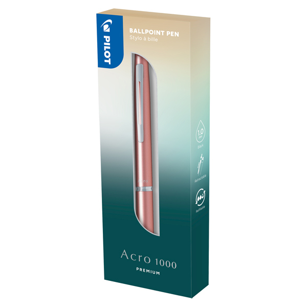 Nuova penna a sfera ACROBALL in versione raffinata ed elegante. Caratterizzata da un fusto sottile con impugnatura e anello centrale in metallo. Inchiostro Acroball super scorrevole ad asciugatura rapida, ideale per mancini. Punta 1,0 mm- Tratto 0,28 mm. Colore inchiostro nero. Ricaricabile con refill BRFV -10 M. Corredata da astuccio regalo in cartoncino riciclabile.