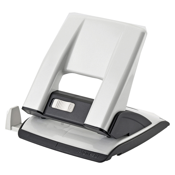 Perforatore a 2 fori in metallo con guida regolabile ed inserti in abs. Di robusta costruzione, consente di perforare fino a 30 fogli con il minimo sforzo. Dotato di meccanismo di sicurezza e salva spazio (blocco/sblocco impugnatura). Pratico e veloce grazie al pulsante preposto posizionato sul fronte dell'impugnatura. Colore bianco. 2 fori.