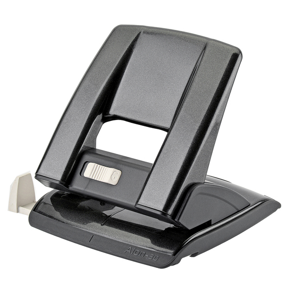 Perforatore a 2 fori in metallo con guida regolabile ed inserti in abs. Di robusta costruzione, consente di perforare fino a 30 fogli con il minimo sforzo. Dotato di meccanismo di sicurezza e salva spazio (blocco/sblocco impugnatura). Pratico e veloce grazie al pulsante preposto posizionato sul fronte dell'impugnatura. Colore nero. 2 fori. Passo 8cm. Garanzia 1 anno.