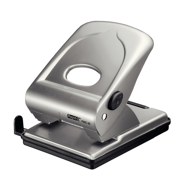 Perforatore FMC40 a 2 fori passo 8cm con guida regolabile. Struttura in metallo e base removibile per la raccolta degli sfridi. Dotato di dispositivo di bloccaggio salvaspazio per la leva di perforazione. Foro da 5,5mm.