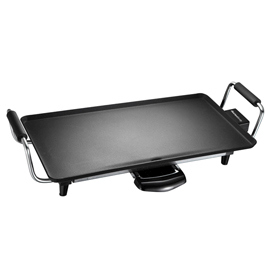 Piastra liscia antiaderente con termostato regolabile, maniglie laterali e piedini antiscivolo che permette di servire in tavola gli alimenti cotti alla piastra grazie alla vaschetta raccogli grasso. Dimensioni piastra: 43x23cm. Alimentazione: 220-240V AC 50-60Hz. Potenza: 2000W.