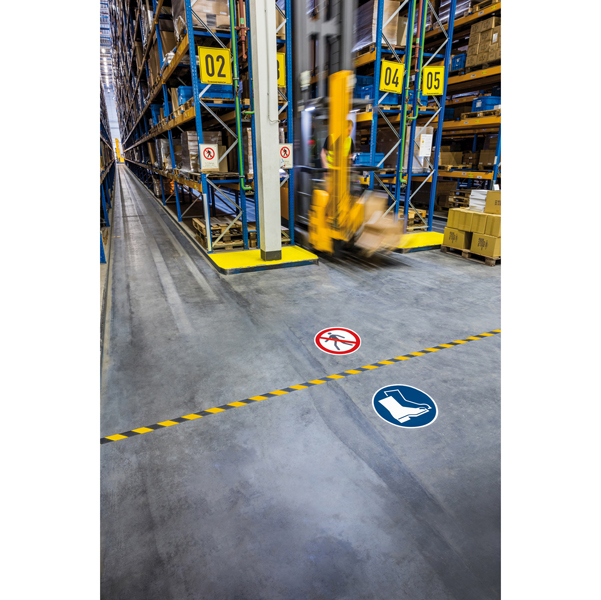 Segnaletica da terra per l'identificazione di aree pericolose, spazi di stoccaggio, passaggi pedonali ecc. Resistenza allo scivolamento R9 e conforme alla normativa DIN 51130. Conforme alla normativa UNI EN ISO 7010. Pittogrammi di sicurezza autoadesive per applicazioni su pavimenti in ambienti interni, come magazzini, centri di distribuzione, produzione, ecc. Resistente all'abrasione. ?À Pittogramma "Calzature di sicurezza obbligatorie" M006 conforme alla normativa UNI EN ISO 7010 ?À Robusto e resistente all