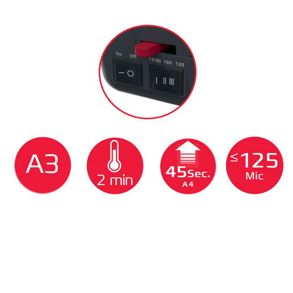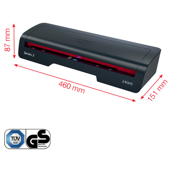 GBC 240HS e' una soluzione elegante ed efficiente per le esigenze di plastificazione di tutti i giorni. Progettata all'insegna dello stile e delle prestazioni, questa plastificatrice A3 ad alta velocita' e' ideale per l'utilizzo a casa o in ufficio. Aumenta la produttivita' e riduci i tempi di plastificazione del 33% utilizzando le pouches ad alta velocita' GBC. Con un tempo di riscaldamento di 2 minuti, plastifica un foglio A4 da 75 micron in soli 45 secondi, rendendolo perfetto per gestire in modo efficiente i tuoi progetti domestici. L'interruttore di controllo, facile da usare, offre tre impostazioni di spessore della pouches da 75 a 125 micron, garantendo flessibilita' per vari tipi di documenti. Una leva di sblocco anti-inceppamento assicura un funzionamento regolare, risolvendo senza sforzo eventuali errori di inserimento delle pouches. Inoltre, il sistema intelligente di LED di stato semplifica il funziona mento con chiare indicazioni visive e acustiche: rosso durante il riscaldamento, blu con un suono quando e' pronto e spegnimento automatico dopo 15 minuti di inattivita' per risparmiare energia. Proteggi e conserva i tuoi documenti importanti con una finitura perfet ta, ogni volta. Colore nero e rosso. Plastifica carte d'identita' fino a documenti di formato A3. Plastifica un documento A4 (75 mic) in soli 45 secondi. Plastifica 13 x A4 in 10 minuti. LED di stato SMART: si illumina di rosso durante il riscaldamento e diventa blu con un segnale acustico quando la plastificatrice e' pronta all'uso. La leva di rilascio degli inceppamenti consente di rimuovere manualmente le pouches errate o inceppate. Include una confezione iniziale di 5x pouches A4 (75 micron). Basso livello di rumore min. (> min. min. )>50Dba per ridurre le distrazioni. Certificato CE, TUV/GS.